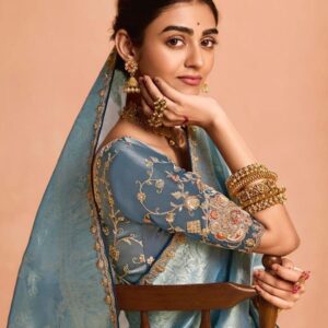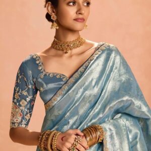 Pastel blue Tissue Silk saree with heavy embroidery border
