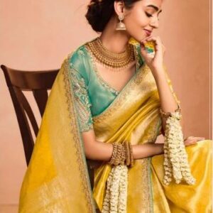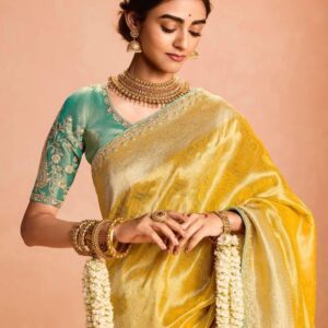 Olive Yellow Tissue Silk Saree with Heavy Embroidery Border
