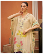 The breezy beige kaftan flows with a relaxed, comfortable silhouette in lightweight fabric, offering a flattering drape and easy movement. Enhanced with intricate Gota Patti work in shimmering gold — delicate metallic ribbons forming elegant motifs — it adds subtle regal sparkle without overpowering the serene beige base.