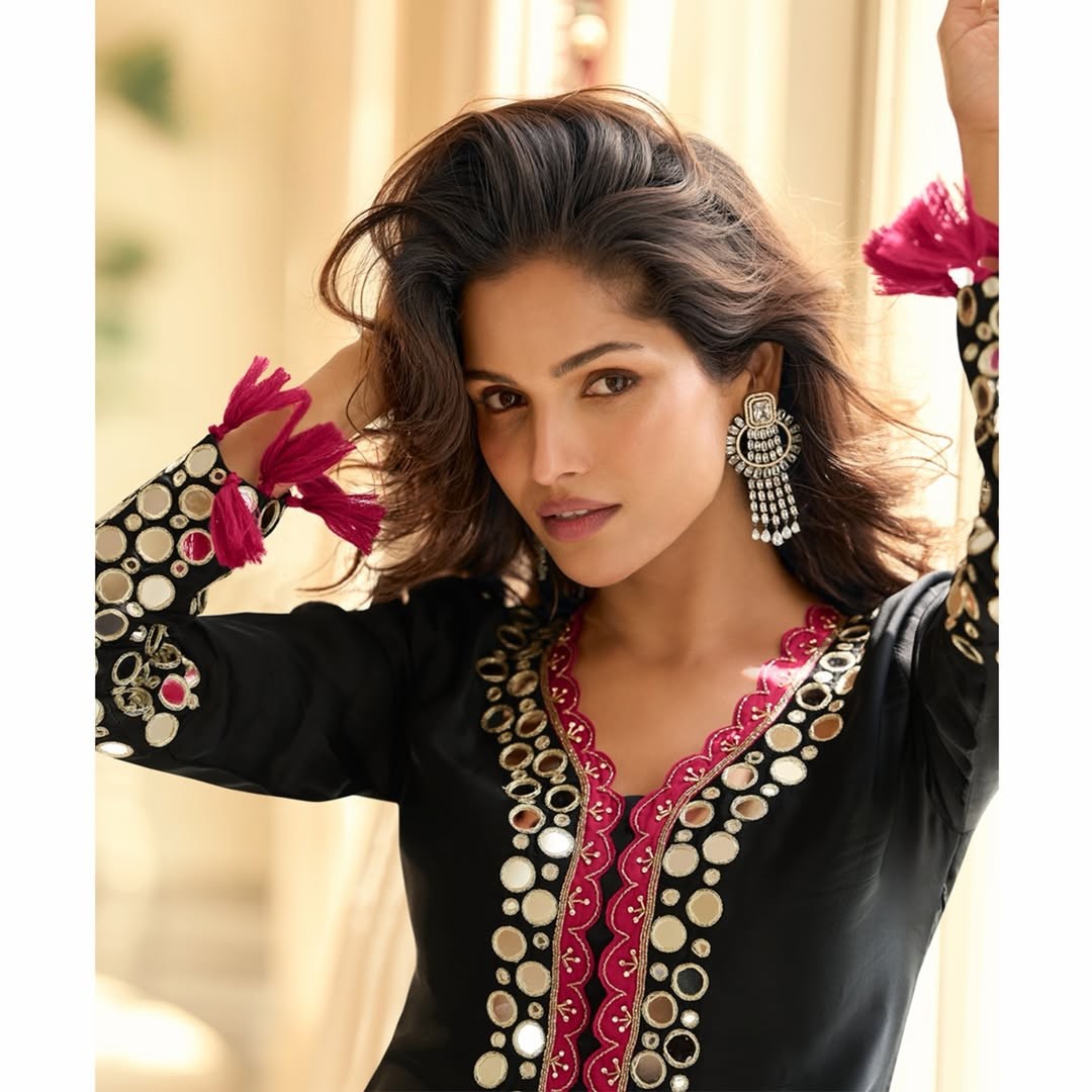 Hand-Original Mirror Embroidered Top – Exquisite hand-embroidered mirror work on a rich black base, creating dazzling light reflections and timeless sophistication with every graceful movement.