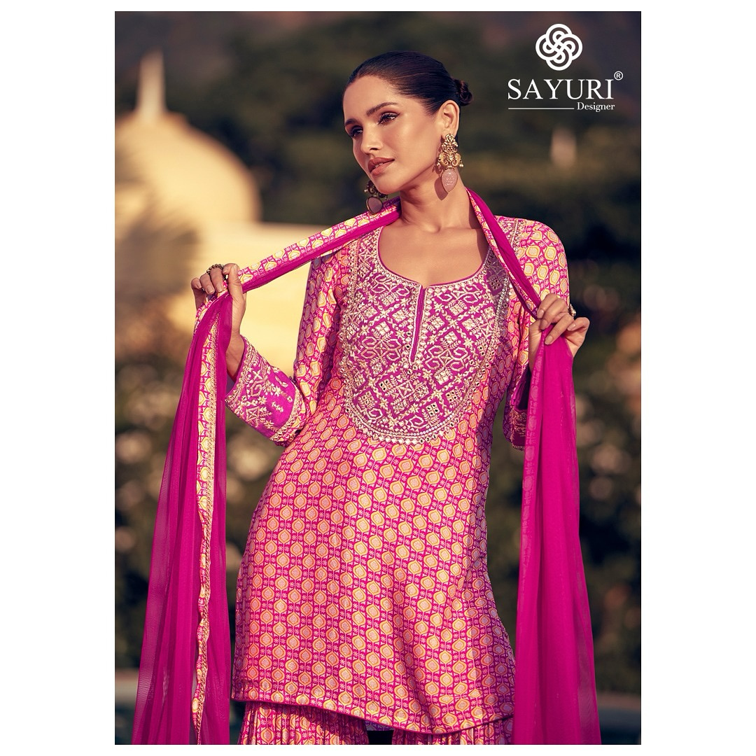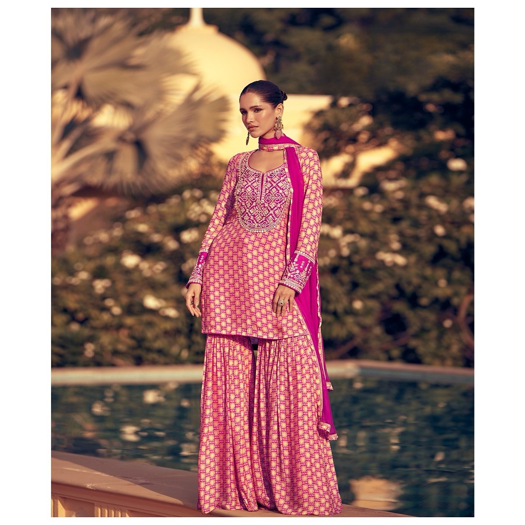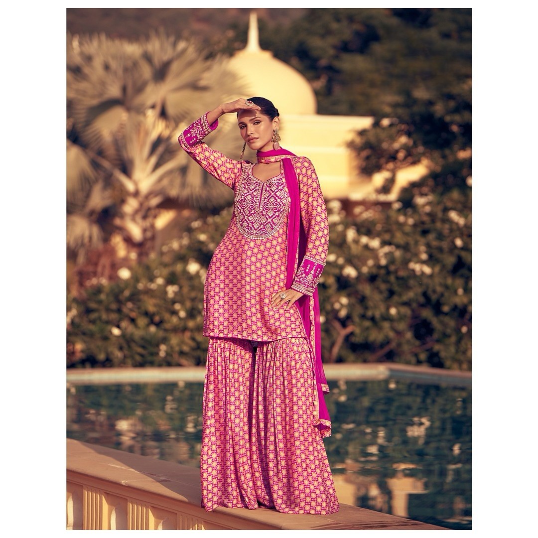 Premium Chinon Silk Gharara Set in a breathtaking digital print that dances with vibrant motifs and rich hues, designed to turn every step into a statement. ✨