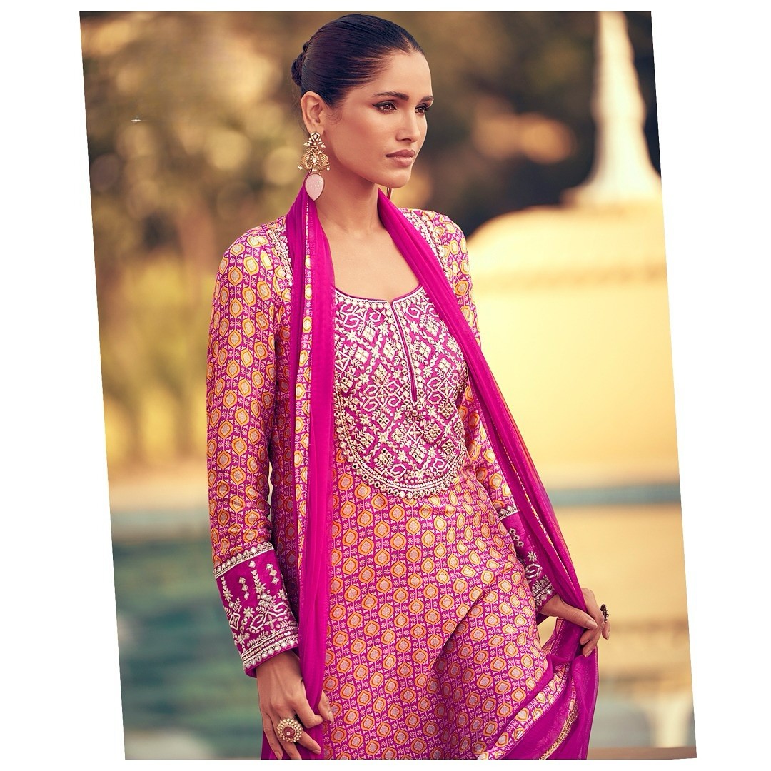 Crafted from the finest, flowy Chinon silk that drapes like a dream, the Gharara silhouette offers voluminous pleats and a flattering fit that moves effortlessly with you, blending traditional elegance with modern sophistication.