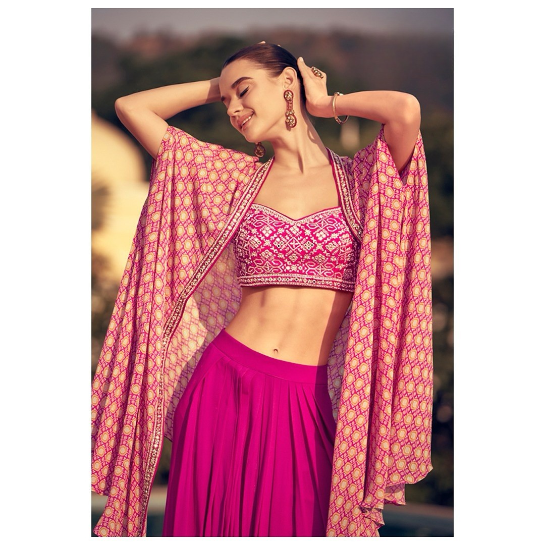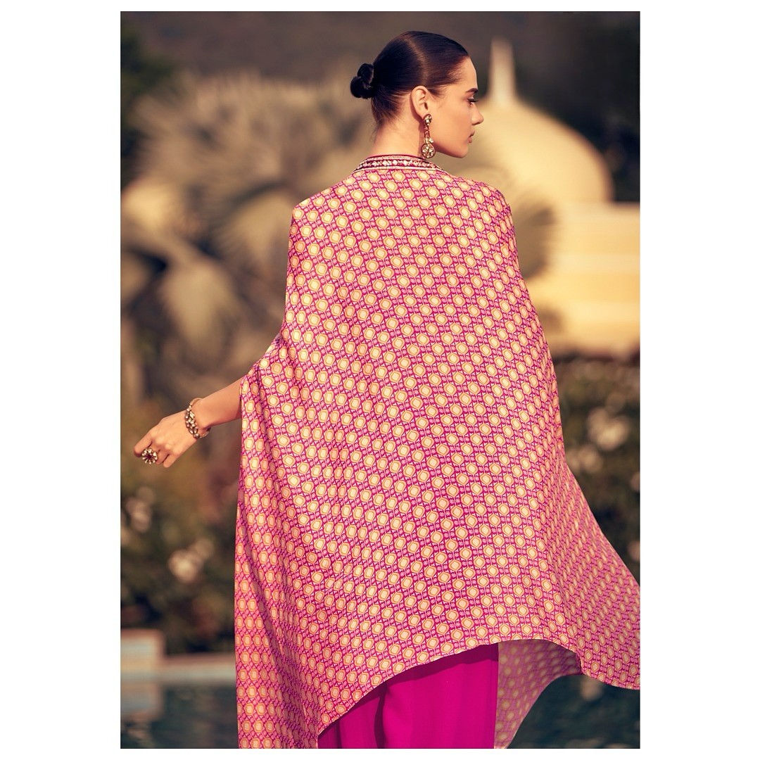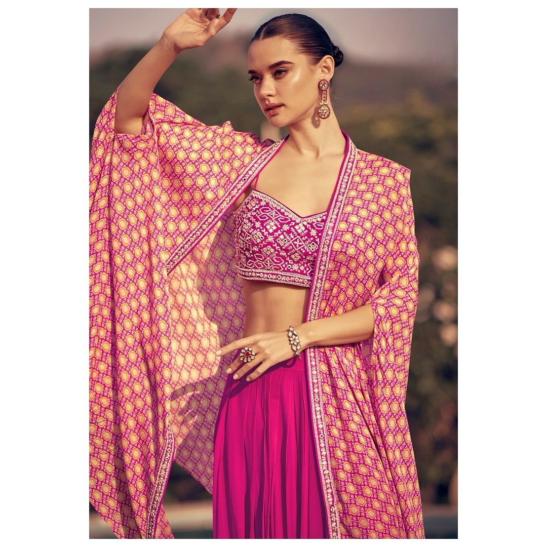 Crafted from the finest, flowy Chinon silk that drapes like a dream, this Indo-Western ensemble features a chic cropped top, voluminous palazzo pants, and a dramatic flowing cape that adds effortless drama and movement, blending traditional elegance with modern sophistication.