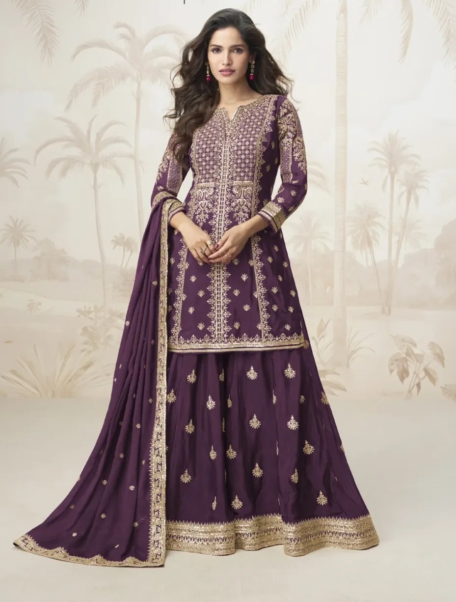 Embrace regal depth and timeless grace in this exquisite deep plum ethnic suit — where rich sophistication meets masterful craftsmanship for an unforgettable festive presence.