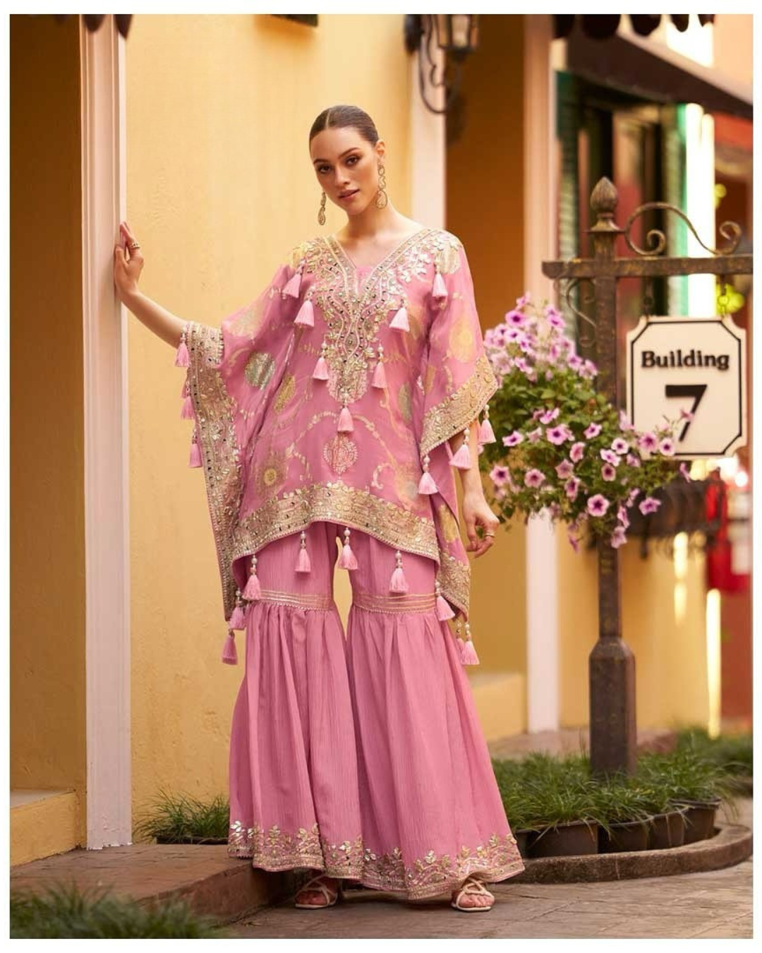 Elevate your festive wardrobe with this dreamy Baby Pink Kaftan and Gharara Set, a perfect blend of soft romance and traditional craftsmanship.