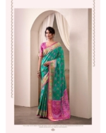 The borders and pallu glow with contrasting golden or multicolored accents — zari outlines, vibrant reds, yellows, and oranges — framing the field in regal borders that add depth and opulent shimmer. The lightweight yet substantial silk drapes beautifully, offering a subtle sheen, luxurious hand-feel, and effortless elegance that moves with graceful fluidity.