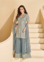 Premium Light Grey Georgette Indo-Western 3PC Set in a soft, sophisticated shade that exudes understated luxury. The ensemble features a stylish short kurta adorned with heavy sequins work that catches every ray of light, creating a dazzling shimmer with each movement. Paired with flowy palazzo pants and a matching georgette dupatta, this set is designed for effortless grace and modern charm. ✨