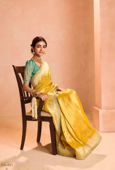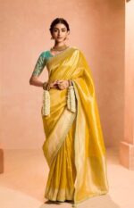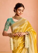 Olive Yellow Tissue Silk Saree with Heavy Embroidery Border