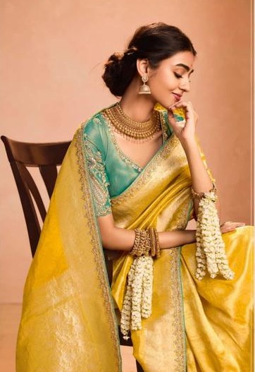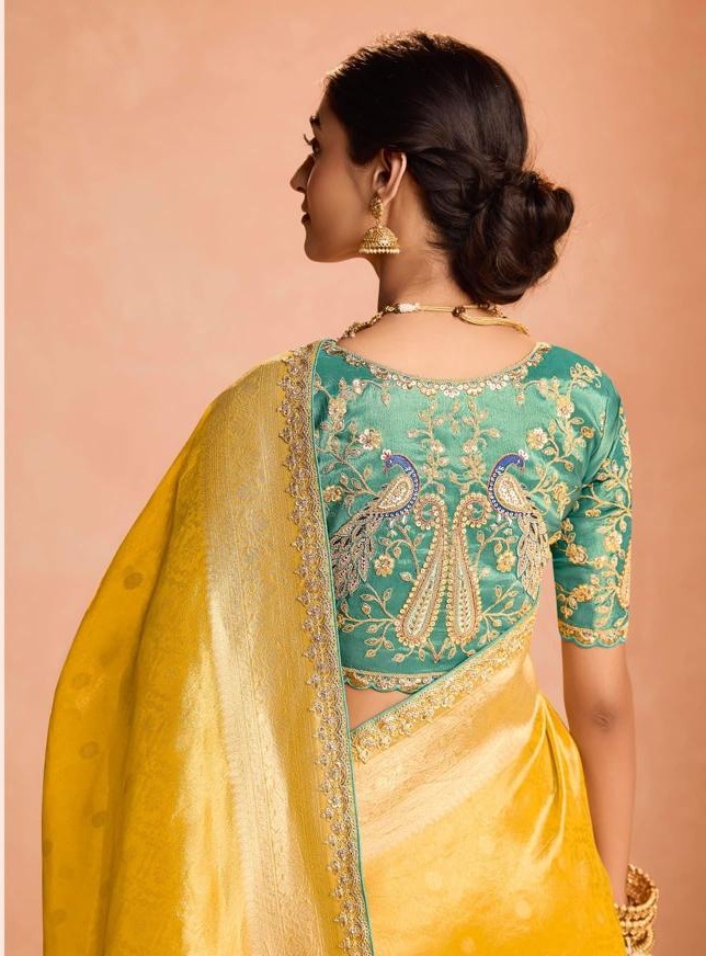 This luminous olive yellow tissue silk saree whispers understated luxury with its lightweight, sheer tissue fabric that drapes like a dream—soft, radiant, and effortlessly graceful. The highlight? A heavy embroidery border bursting with intricate zari, sequins, and detailed motifs that add opulent sparkle and depth, turning every swirl into a statement of refined sophistication.