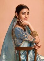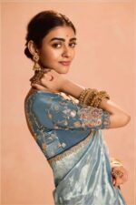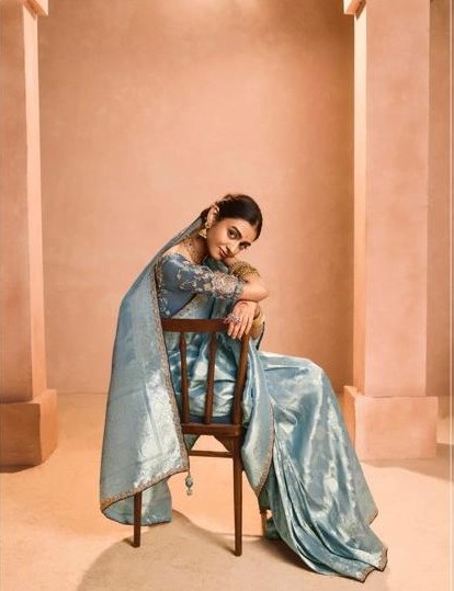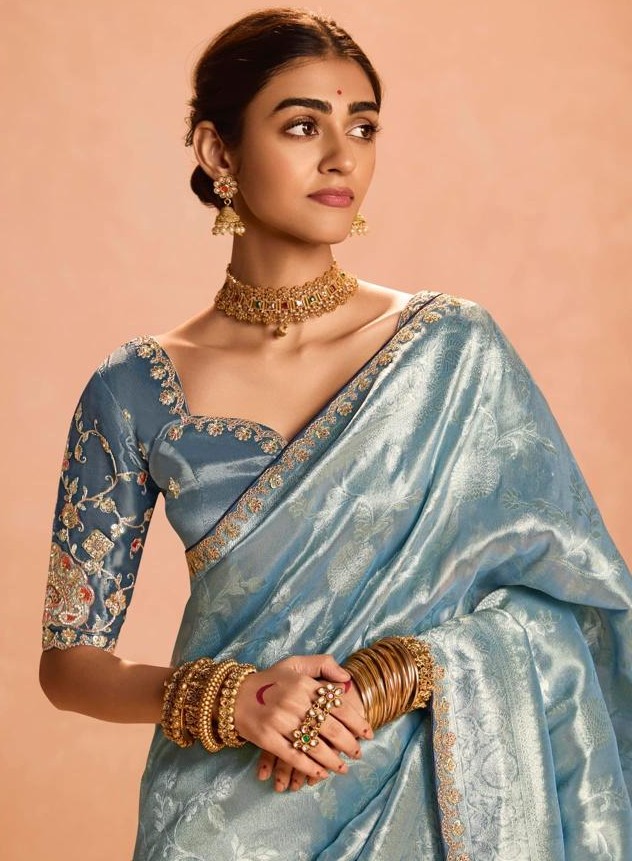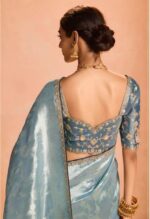 This ethereal pastel blue tissue silk saree whispers elegance with its lightweight, sheer tissue fabric that drapes like a dream—soft, luminous, and effortlessly graceful. The highlight? A heavy embroidery border bursting with intricate zari, sequins, and detailed motifs that add opulent sparkle and depth, turning every swirl into a statement of refined luxury.