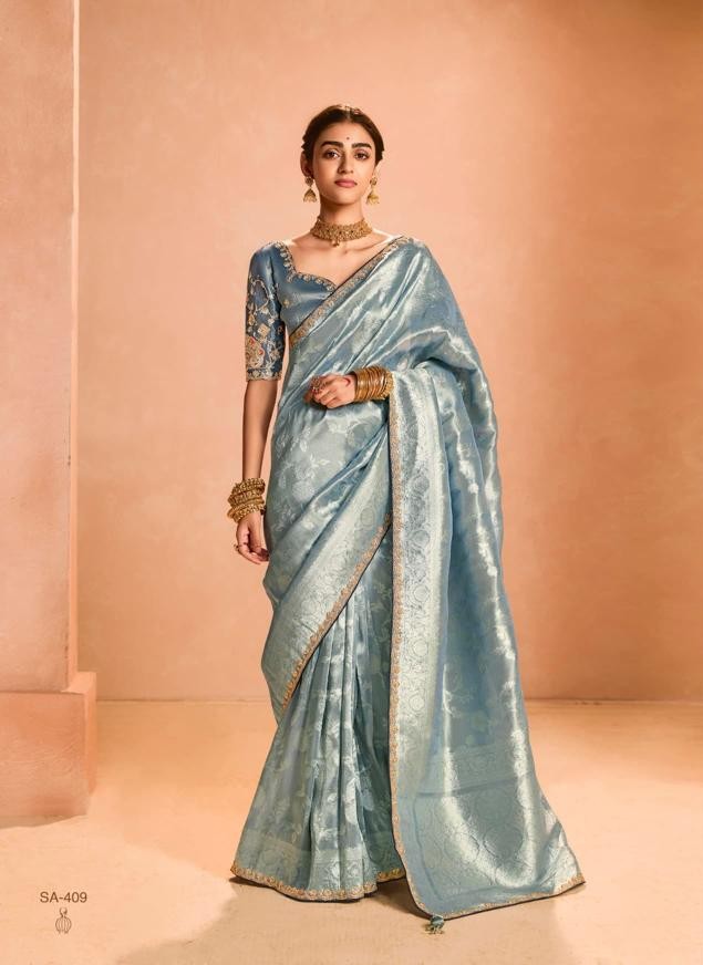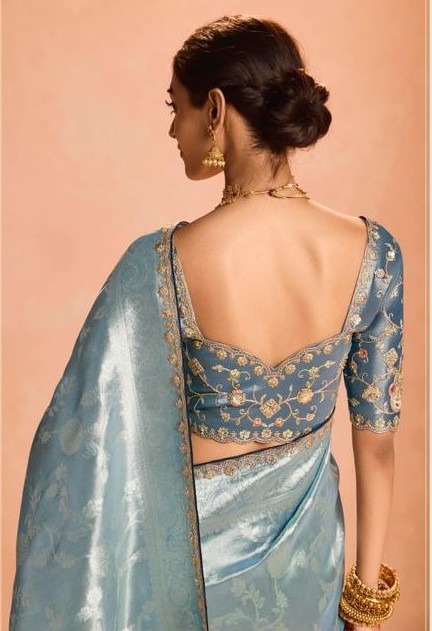 Pastel blue Tissue Silk saree with heavy embroidery border
