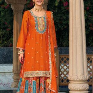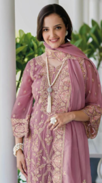 Indulge in timeless elegance with this beautifully crafted ensemble, designed to elevate your style for any special occasion. The top is made from soft organza, delicately adorned with intricate embroidery work, adding a touch of sophistication and charm. Its lightweight and sheer texture ensure both comfort and grace, making it ideal for festive gatherings or formal events.
