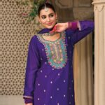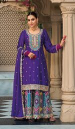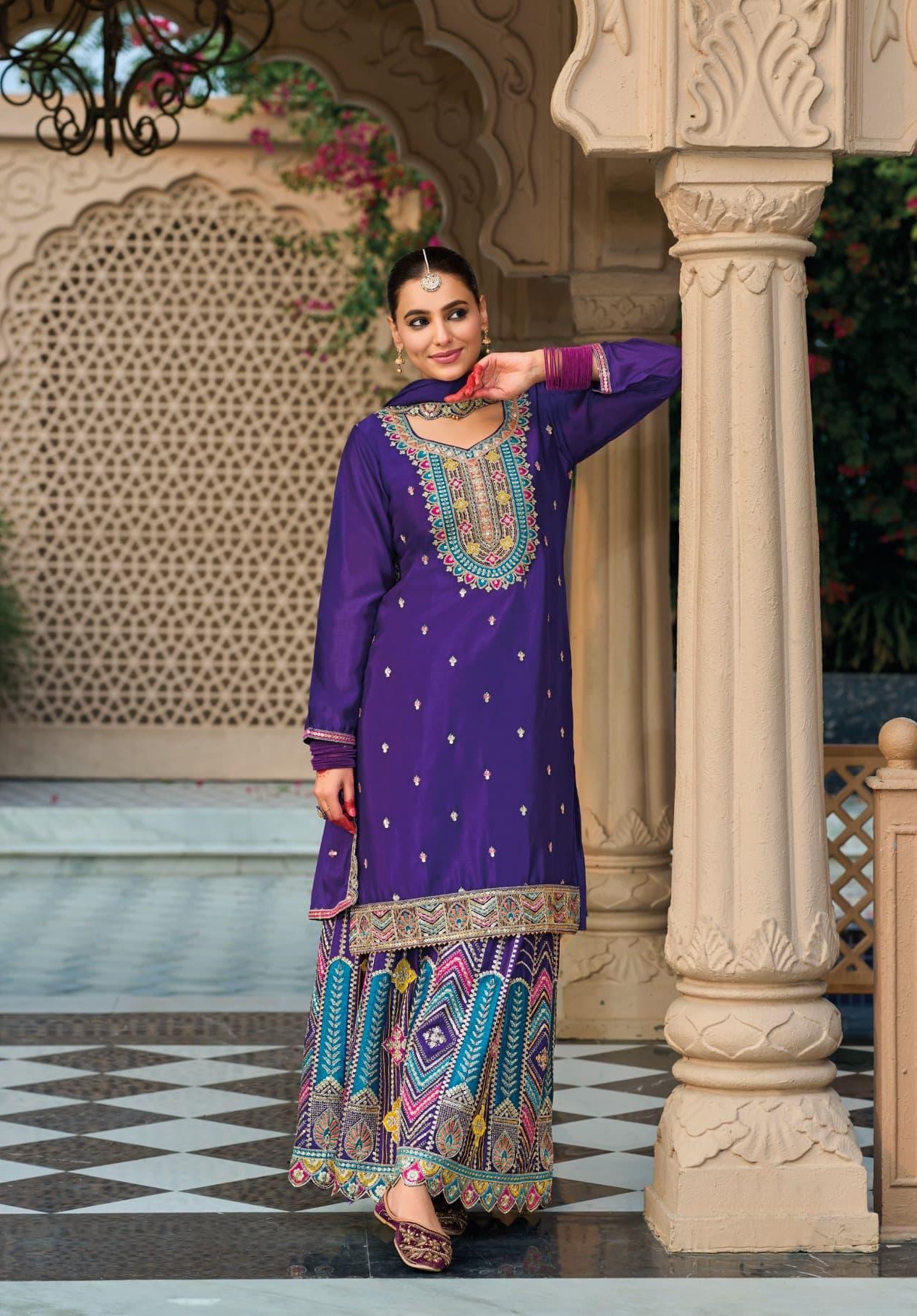 Turn heads in our stunning Bluish Purple Chinnon Palazzo Suit, featuring intricate embroidery, flowy elegance, and unmatched comfort. Perfect for weddings, festive celebrations, and special occasions, this three-piece set includes: