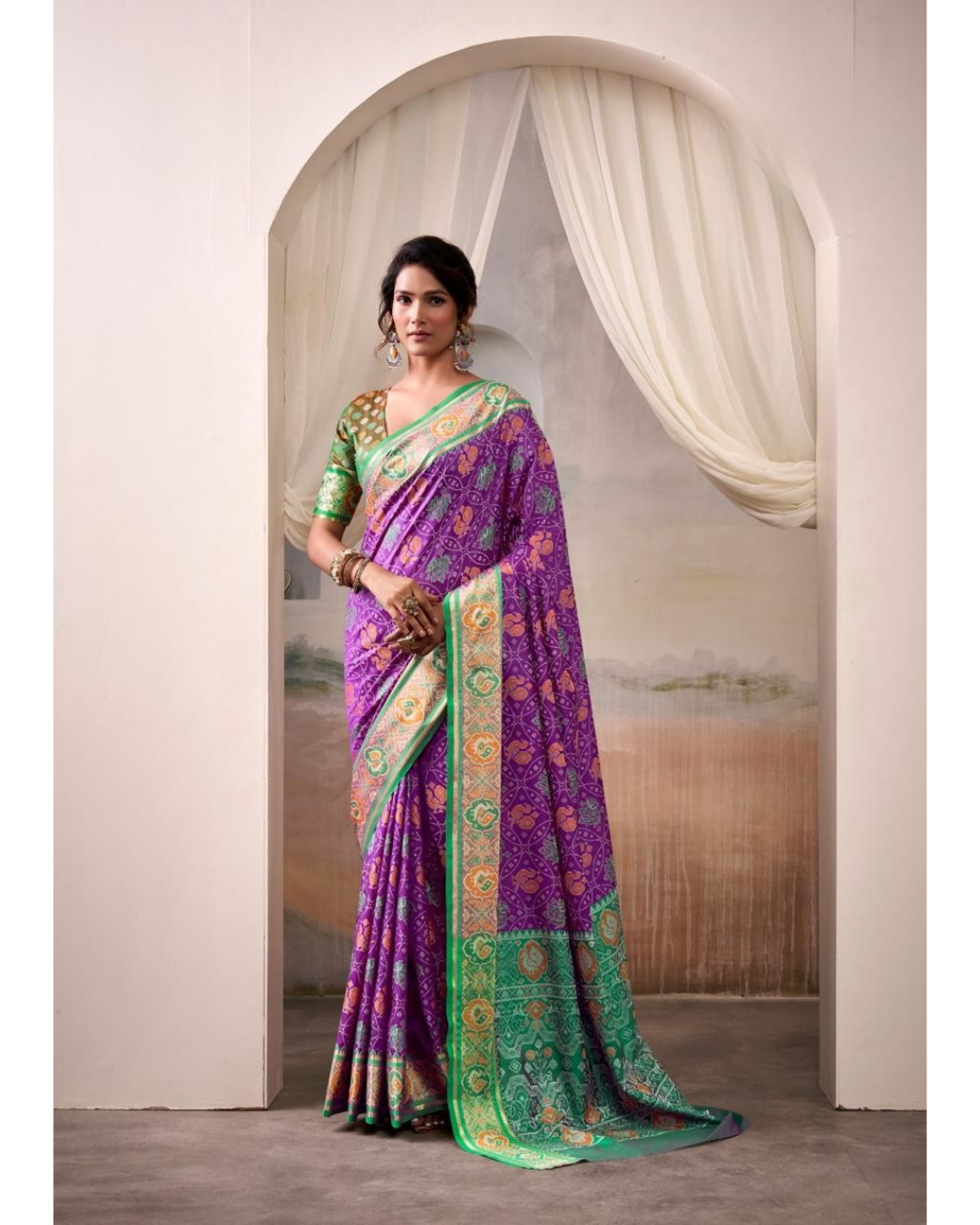 Paired with a contrast green blouse (in a fresh emerald or bottle green shade), the combination creates a breathtaking visual harmony — the cool green pops vividly against the warm purple, enhancing the saree’s intricate weaves while adding a fresh, festive energy. The blouse can be styled with subtle detailing or matching motifs to complement the patola’s heritage patterns perfectly.