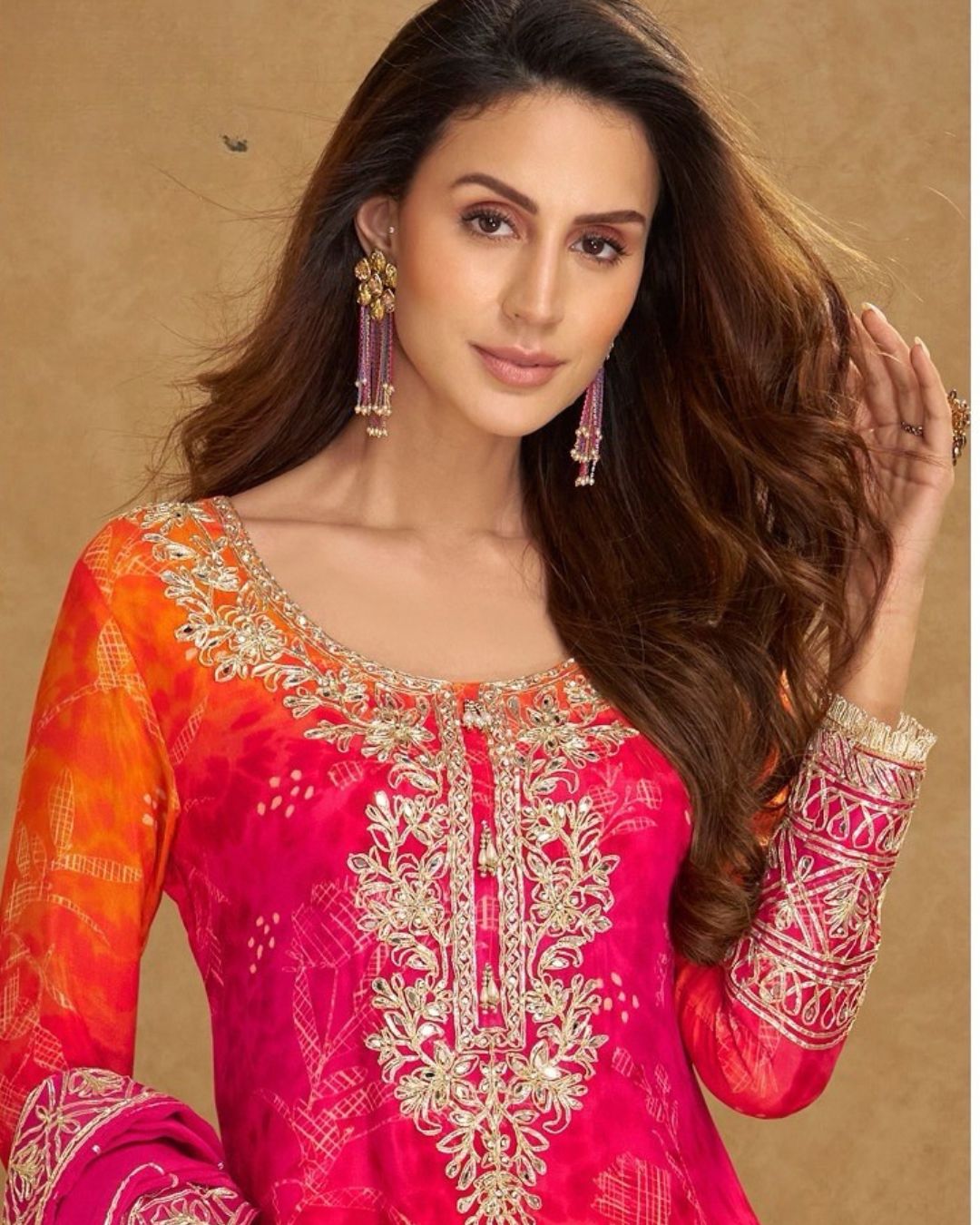 FABRIC – REAL PREMIUM CHINON SILK ( HEAVY EMBROIDERED RIBBIN GOTA WORK TOP WITH FRONT AND BACK WORK SHARARA WITH EMBROIDERED DUPATTA )