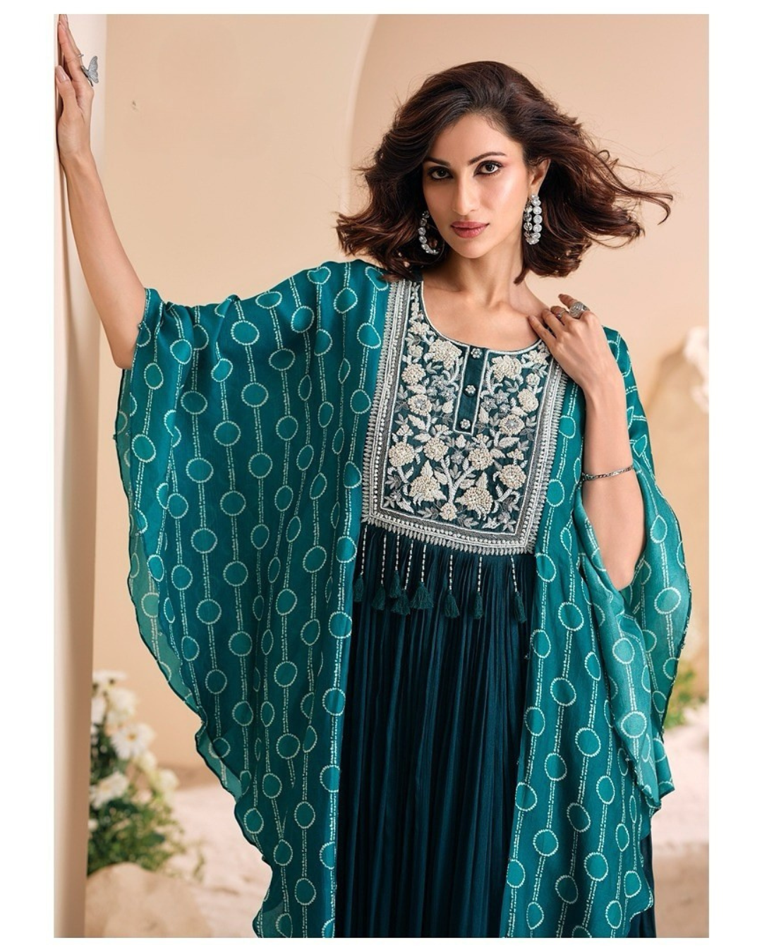 Kaftan Style Sleeves – Flowy, dramatic wide sleeves that offer effortless movement, modest coverage, and a regal, ethereal drape – blending traditional kaftan flair with contemporary evening glamour.