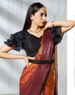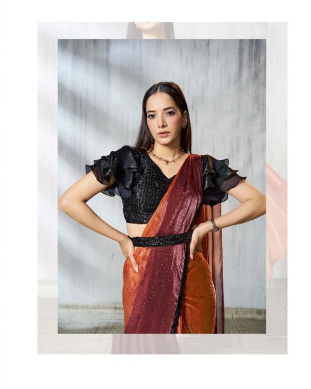 Turn heads with bold contrast and modern drama in this striking two-tone orange and black satin ready-to-wear saree — a fearless fusion of vibrant energy and sleek sophistication.