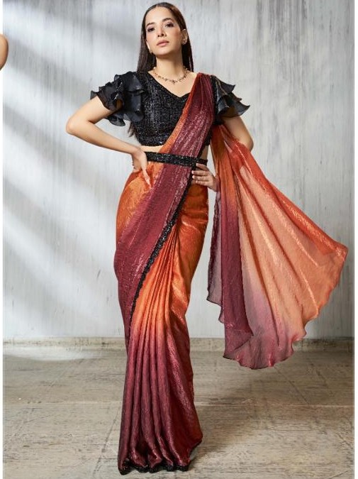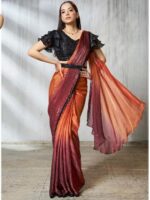 Crafted from glossy, smooth satin silk, the saree features a captivating two-tone design: rich, fiery orange flowing into deep, dramatic black, creating a striking gradient that catches light beautifully and adds depth with every drape. Pre-stitched and ready in seconds, it delivers perfect pleats, a graceful pallu, and effortless movement without any draping effort.